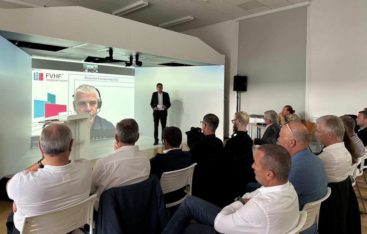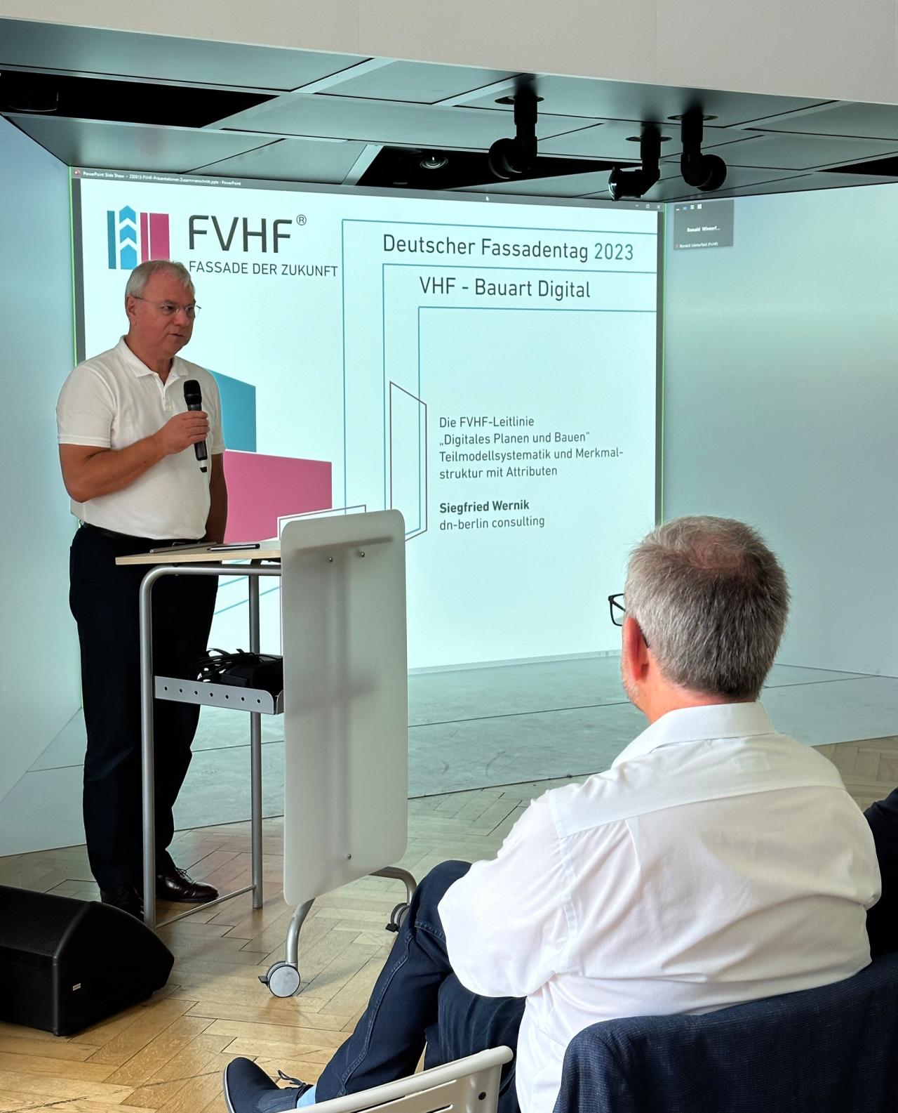 Gestartet war der 19. Deutsche Fassadentag unter dem Titel „VHF – Bauart Digital“ mit einem digitalen Willkommen des FVHF-Geschäftsführers Ronald Winterfeld, der die 50 geladenen Gäste in der Cave und viele weitere im YouTube Livestream begrüßte und über den Start des Projektes vor sieben Jahren und aus den weit über 100 Arbeitskreistreffen berichtete. Zusammen mit 13 Arbeits- und sieben Redaktionsgruppen unter der Leitung von Winterfeld und Oliver Fröhlich (BWM) „entstand das VHF-BIM-Fachmodell, das mit heutigem Stand das VHF-Prozessmodell, den Ansatz der Teilmodelsystematik, eine neutrale maschinenlesbare Datenstruktur aller VHF-Konstruktionsgruppen und deren Komponenten sowie deren internationale Verfügbar- und Nutzbarkeit enthält und das Bauen effektiver und effizienter machen wird“, stimmte Winterfeld die Gäste auf die kommenden 120 Minuten ein. Ein großer Dank ging an den langjährigen Wegbereiter und Wegbegleiter Siegfried Wernik, unter dessen fachlicher Anleitung die Klassen- und Merkmalstruktur für die VHF erarbeitet wurden.