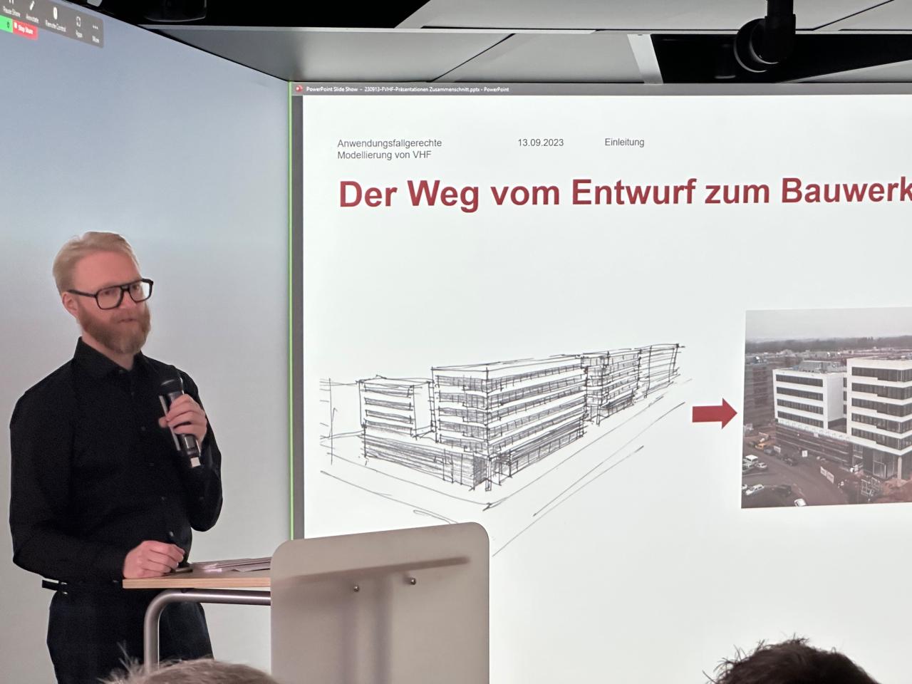 BIM-Implementierung in der LehreIm letzten Beitrag des Tages begeisterten Prof. Dr. Ulrich Möller, Professor für Bauphysik und Baukonstruktion an der HTWK-Leipzig und Christian Irmscher, Spezialist für die BIM-Implementierung, die 50 Teilnehmerinnen und Teilnehmer des 19. Deutschen Fassadentages mit einer beeindruckenden Vorführung der Möglichkeiten, virtuelle Gebäudemodelle dreidimensional zu Visualisieren. Anschließend nutzten alle Anwesenden die exklusive Gelegenheit, das 3D-Modell des Pilotprojektes live in der BIM-Cave der HTWK-Leipzig zu begehen.