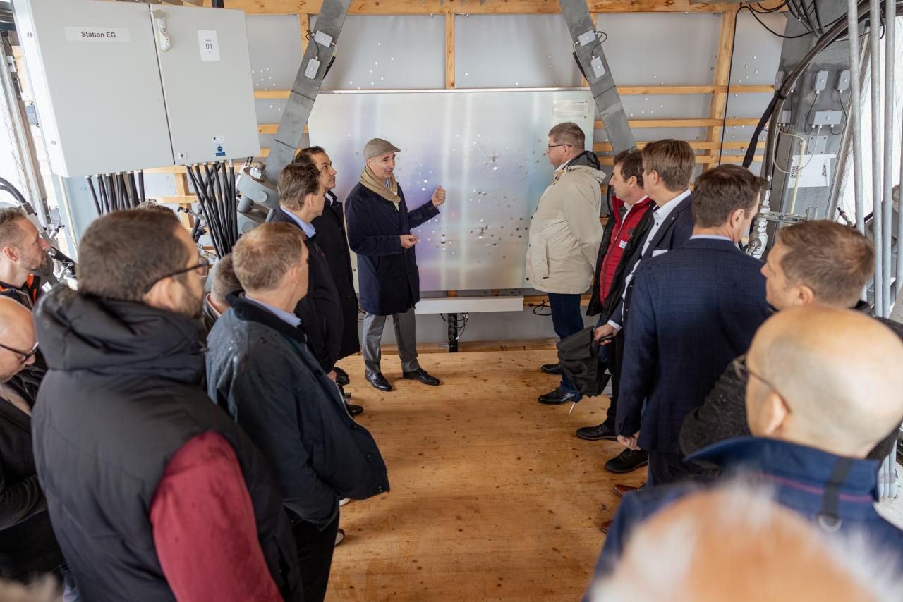 Anhand des adaptiven Demonstratorhochhauses D1244 – einem modularen Forschungsturm mit rückbaubaren Fassaden-Mock-ups – zeigte er, wie sich Hüllen als Testfelder nutzen lassen. Die Systeme reichen von faserbasierten Leichtbaufassaden über kinetische Sonnenlenksysteme bis hin zu Doppelfassaden. Bereits am Vormittag hatten die Gäste das Gebäude bei einer exklusiven Führung besichtigt.