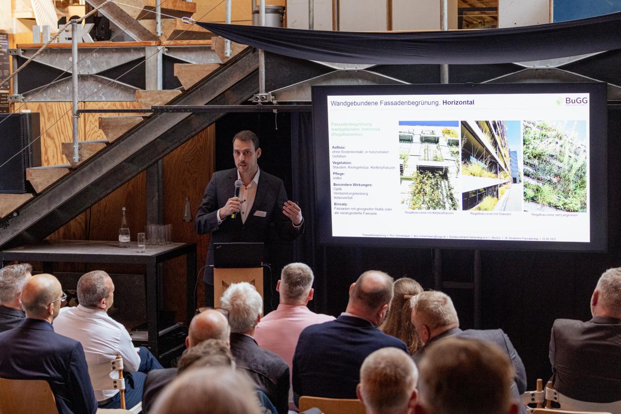 Felix Mollenhauer (Bundesverband GebäudeGrün e.V.) stellte die breite Wirkungspalette der Fassadenbegrünung vor – von Temperaturregulierung und Luftreinigung über Schallschutz bis hin zur Förderung von Biodiversität im Stadtraum. VHF böten dafür ideale Voraussetzungen, etwa durch modulare Nachrüstung und konstruktiven Schutz.