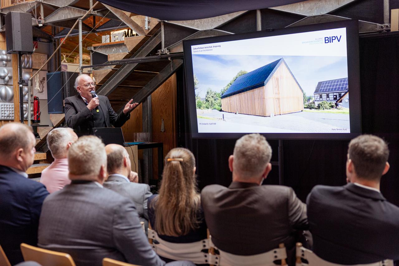 Fabian Flade (Allianz Bauwerkintegrierte Photovoltaik e. V.), plädierte für eine stärkere Nutzung von Fassaden zur Stromgewinnung – insbesondere im urbanen Raum. Anhand preisgekrönter Beispiele aus dem In- und Ausland zeigte er, dass Energiegewinnung und Architektur keine Gegensätze sein müssen. „Photovoltaik muss raus aus der Nische – sie gehört dorthin, wo Fläche ist: an die Gebäudehülle. Je früher wir anfangen, einfache wie anspruchsvolle Lösungen zu realisieren, desto größer unser Beitrag zur Energiewende“, so Flade.