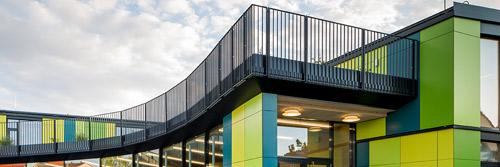 Da wegen des Neubaus der Montessori Mittelschule relativ wenig Schulhoffläche bestehen bleibt, ist das Auladach nach Osten hin geneigt und geht in einen befestigten Erdhügel über. So kann das Dach vom 1. OG aber auch vom ebenerdigen Schulhof begangen werden und als Schulhoferweiterung genutzt werden.