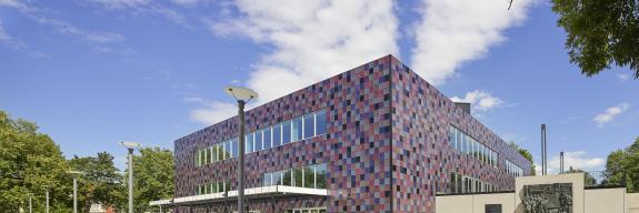 Die denkmalwürdige Stadthalle wurde nach knapp 60 Jahren Nutzungsdauer nachhaltig saniert. Die einzigartige Fassadenbekleidung aus dreidimensionalen keramischen Kacheln wurden wiederverwendet. Auf Grund von Größenänderung durch die energetische Sanierung und gestalterischen Entscheidungen (weiße Kacheln nur für additive Elemente), mussten zusätzlich neue Kacheln produziert werden. Die Neugestaltung der Fassade ergänzt das bestehende Vokabular, unter Verwendung zweier neuer Kachelfarben mit nur einer Reliefgeometrie (Quadrat).