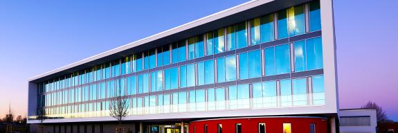Das klassisch moderne Gebäude setzt sich gestalterisch aus einem zurückgesetzten schwarzen Sockel und einem darauf schwebenden weißen Riegel zusammen. Realisiert wurde diese Fassade in den geschlossenen Bereichen mit einer VHF im System Knauf Außenwand mit AQUAPANEL® Technologie, die sich als beste Lösung für eine streiflichtfreie und wirtschaftliche Ausführung herausgestellt hat.