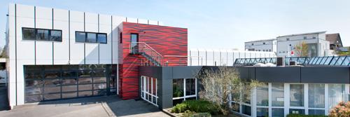Eine individuell gestaltete vorgehängte hinterlüftete Fassade mit rot-grauem Zebramuster zieht auf dem Produktionsgelände in der Nähe von Heilbronn alle Blicke auf sich. Sie setzt moderne Akzente auf dem Grundstück des Traditionsunternehmens Aluform