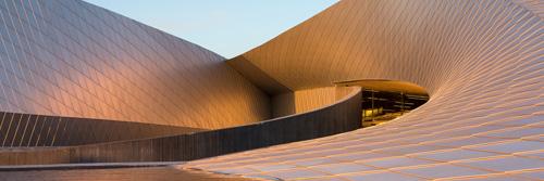 Realisiert mit einer vorgehängten hinterlüfteten Fassade wecken die changierenden Oberflächen und freien Formen Assoziationen an das Element Wasser. Foto: Novelis