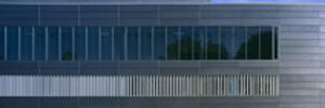 Nach außen präsentiert sich der Gebäudekomplex zurückhaltend als kompaktes Volumen mit einer durch horizontale Fensterbänder gegliederten Fassade. Die Brüstungen und geschlossenen Fassadenbereiche sind mit einer vorgehängten hinterlüfteten Metallverkleidung aus pulverbeschichteten, anthrazitfarbenen Aluminium-Blechkassetten verkleidet.