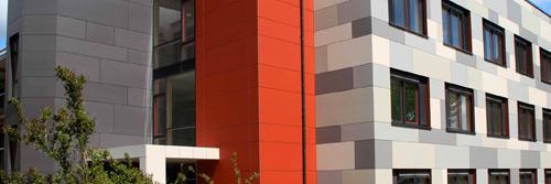 Ein kräftiges Rot setzt im Eingangsbereich einen warmen Akzent zur vorgehängten hinterlüfteten Fassade (VHF) des Gebäudekomplexes in Grau-Nuancen Foto: FRAHAMMER GmbH & Co. KG
