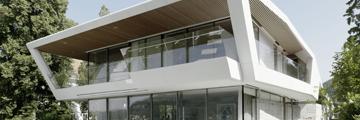 Inspiration für die Gestaltung der Gebäudehülle des Wohnhauses fanden die Planer in der Umgebung des Projektes: Vom Land aus erinnert die Villa mit dem geschwungenen Dach aus fibreC Paneelen an die anmutige Form eines Schwanes, der über den türkisblauen Wellen dahingleitet. Geformte fibreC 3D Fassadenelemente als vorgehängte hinterlüftete Fassade sorgen für einen nahtlosen Übergang vom Dach zur Untersicht und zur Fassade.