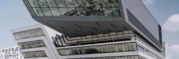 Als gestaltprägendes Fassadenmaterial favorisierten Zaha Hadid Architects eine VHF mit Glasfaserbetonplatten. Im Rahmen der Ausschreibung konnte die österreichische Rieder Gruppe mit ihren fibreC Fassadenpaneelen den Auftrag zur Herstellung für sich entscheiden. Die nur 13 mm dicken Glasfaserbeton-Elemente konnten, über die unterschiedlich farbige Betonoptik hinaus, den Ansprüchen der Stararchitektin gerecht werden – hinsichtlich Ästhetik, Materialqualität und in Bezug auf die produktionstechnische Herausforderung, mit gekrümmten Plattenformaten den Entwurf einer leicht geschwungenen Gebäudekubatur zu