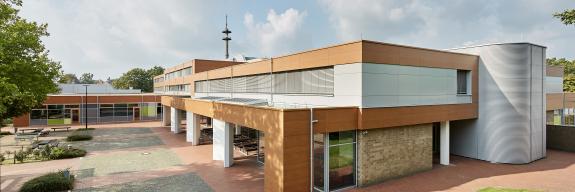 Mit dem Ersatz der alten asbesthaltigen Faserzementplatten durch eine moderne nachhaltige Fassadenbekleidung konnten bei der Sanierung der GBS Nordhorn nicht nur die anspruchsvollen technischen energetischen Standards auf den aktuellen Stand gebracht, sondern auch die Optik der Schule deutlich verbessert werden. Dabei sorgt die Kombination der im unregelmäßigen Wechsel montierten Designs Woods und Chameleon für den besonderen Reiz der etwa 2500 m² großen Fassadenfläche