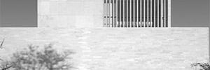 Ein einziges Material bestimmt den Habitus des Hauses: Kalkstein, das Material des Baugrundes. Gesägt und grob geschliffen wird er in seiner Materialität für die sinnliche Qualität des Bauwerks bestimmend. Proportion und Raum sind die alleinigen Kriterien der architektonischen Aussage. Der Kubus als stereometrische Plastik, im Innern aufgelöst in transparente Ebenen, die über die gerasterten Fassadenflächen belichtet sind; eine mehrschichtige Haut aus Glas und vorgehängtem Naturstein, getrennt nach Witterungsschutz und Lichtinszenierung.