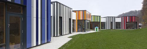 Ein umfassendes Raumprogramm, systematisch strukturiert und gestaltet und geschickt eingefügt in die topografische Situation der Landschaft, sind gute Voraussetzungen, frühzeitig und nachhaltig das Bewusstsein für Orientierung, Ordnung und Disziplin zu prägen. Die abwechslungsreihen Farben, in denen die vorgehängte hinterlüftete Fassade strahlt, verleihen dem Ensemble eine fröhliches, kindgerechte Optik.
