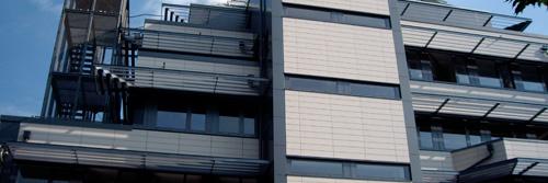 Horizontal laufende Keramikbänder gliedern die Fassade geschossweiße. Die Fensterelemente sind vierseitig mit einem Aluprofil als Laibung umrahmt. Das Element besteht aus Alucobond, feststehendem Sonnenschutz und Dreh-Kipp-Flügeln. In der erdgeschossigen Zone wurden zwischen die Stützen geschosshohe Pfosten-Riegelfassaden aus Aluminium eingebaut. Die Verkleidung der Stützen im Erdgeschoss wurde aus Gründen des Vandalismusschutzes nicht als vorgehängte, hinterlüftete Keramikfassade (VHF) ausgeführt, sondern mit flächig aufgebrachtem Feinsteinzeug.