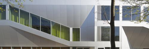 Mit fünf exponierten Fassaden bildet der Neubau der Berliner Architekten raumzeit die neue Mitte am Campus Holländischer Platz im innerstädtischen Nordosten von Kassel. Präzise angeordnete und lebhaft reflektierende Aluminiumtafeln bekleiden das kompakte Gebäudevolumen mit markanten Vor- und Rücksprüngen. Im Verlauf der ansteigenden Hörsäle macht die vorgehängte hinterlüftete Fassade die Schnittgestalt der beiden Längsseiten erlebbar. Sie umfasst auch Loggien, Einschnitte und Rücksprünge. Dergestalt setzen die Architekten Außen und Innen des kompakten Baukörpers zueinander in Beziehung. Das Gebäude von raumzeit Architekten aus Berlin erhielt den Deutschen Fassadenpreis für VHF 2015.