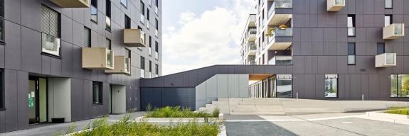 Die FRANZEN Fassadentechnik GmbH wurde beauftragt, an 3 von 5 Gebäudekomplexen insgesamt fast 5.000 m² Faserzementfassade mit 8mm Faserzementplatten, genietet befestigt, innerhalb einer Ausführungszeit von Mai 2013 bis Juli 2014 zu verlegen.