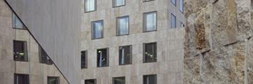 Im November 2006 wurde das neue Jüdische Zentrum am Jakobsplatz in München mit einer feierlichen Zeremonie eingeweiht. Das aus drei Gebäudekomplexen - der Synagoge, einem Museum und einem Gemeindehaus - bestehende Ensemble repräsentiert seitdem die Fülle und den Reichtum des jüdischen Lebens in der bayerischen Metropole. Alle drei Gebäude sind klar als Einheit zu erkennen und beeindrucken doch gleichzeitig durch ihre Eigenständigkeit. Diese wird nicht nur über ihre unterschiedliche Architektur formuliert, sondern begründet sich vor allem im Spiel mit dem Fassadenmaterial Naturstein. Hochwertiger Travertin bildet mit einer Dämmung aus Steinwolle als vorgehängte Fassade eine moderne wie funktionale Konstruktion.