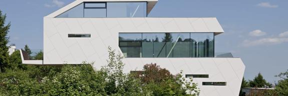 Schon von ferne ist das Objekt geprägt durch die subtile Musterung, die sich aus der Verlegeart der Fassadenverkleidung ergibt. Die Diagonale als Gestaltungselement setzt sich in den Innenräumen fort. Im Inneren hat man die Wahl zwischen dem Aufstieg über die schwebende Treppe oder einem Aufzug, der vom Garagengeschoss bis in die oberste Ebene, die Schlafebene, führt. Die fünf Geschosse wiederum ergaben sich aus der möglichst guten Ausnutzung der Hanglage des Grundstückes und der Gewährleistung, auch dann noch einen Ausblick und ein hohes Maß an Privatheit zu haben, sollte auf den Nachbargrundstücken gebaut oder umgebaut werden.