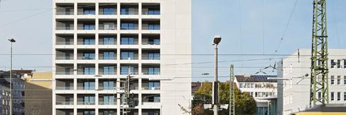 Das sanierte Wohnhochhaus ist nun ein markanter Blickfang direkt am  Pforzheimer Hauptbahnhof. Aus dem Kontrast zwischen der hellen  Betonfassade und den Einschnitten, die mit dunklen Faserzementtafeln  gestaltet sind, ergibt sich der besondere Effekt des monolithischen  Baukörpers. Foto: Dietmar Strauß, Besigheim