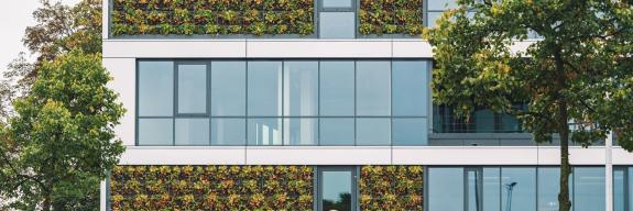 Für die Wärmedämmung wurde ein mineralischer Dämmstoff von Isover verbaut – passend zur Systemlösung und abgestimmt auf die bauphysikalischen Anforderungen des Gebäudes. Zusätzlich integriert: vertikale Begrünungselemente, die die harte Fassadenstruktur auflockern und gleichzeitig einen Beitrag zur Nachhaltigkeit leisten.