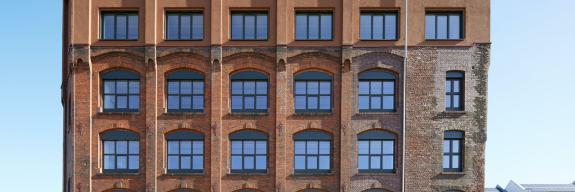 Die ursprüngliche Backsteinfassade mit ihren charakteristischen Rundbögen wurde denkmalgerecht saniert und in den oberen beiden Geschossen um eine moderne Vorhangfassade ergänzt.