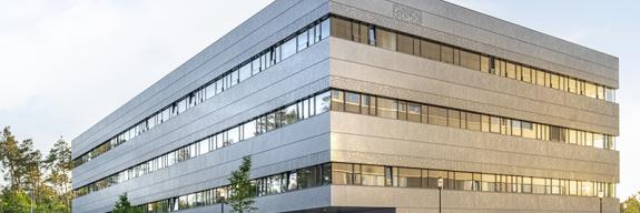 Ein technoider Charakter prägt die horizontal strukturierte Aluminium-Fassade mit ihrer taktil wirkenden, an mikroskopisch vergrößerte Nanostrukturen erinnernden Oberfläche.