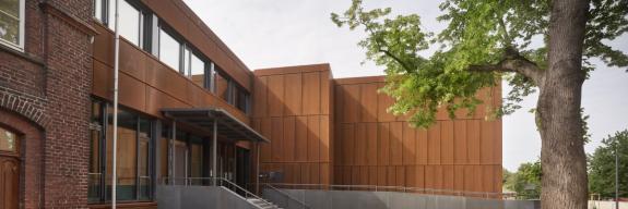 Das Magazin wurde als Erweiterung eines bestehenden Gebäudeensembles geplant und gebaut. Der Eingangsbereich des Kreis- und Stadtarchivs ist zugleich Übergang zu dem herausragenden Hauptgebäude des Ensembles, einer denkmalgeschützten ehemaligen Landwirtschaftsschule von 1890, die seit 2002 als Verwaltungsgebäude genutzt wird. Mit der Fassade aus Cortenstahl greift das Architekturbüro Banz + Riecks aus Bochum die bestehende Architektursprache auf und entwickelt diese weiter: Das Material hebt sich bewusst von den Bestandsgebäuden ab, orientiert sich jedoch in der Farbigkeit an der Umgebung und dem an diesem Ort dominierenden Backstein. Im Laufe der Zeit wird sich auf dem Stahl eine individuelle Patina entwickeln – die Fassade des Archives schreibt so seine eigene Geschichte.