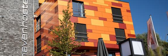Havenhostel Stade – Moderne Plattenfassade in drei Rottönen