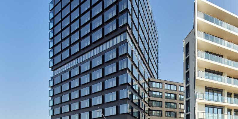 Der markante Campus Tower hat zusammen mit dem sechsgeschossigen Büroriegel insgesamt rund 13.300 Quadratmeter Fläche, in die sich u.a. die HafenCity Universität und diverse Start-ups eingemietet haben. An der Spitze des Turms in 56 Metern Höhe bietet eine Panoramabar spektakuläre Einblicke in den Hamburger Hafen und das HafenCity-Quartier. Nach außen abgeschlossen wird die Stahlbetonkonstruktion von einer vorgehängten hinterlüfteten Fassade (VHF) aus langlebigen, seewasserfesten und nicht brennbaren Fassadentafeln EQUITONE [natura] PRO. Sie zeichnen sich durch ihre besondere Härte und Widerstandsfähigkeit gegenüber Kratzern und Graffiti aus.
