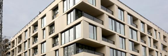Ein Effekt, den die unterschiedliche Oberflächenbehandlung zusätzlich unterstützt. Zum Platz hin strahlt das Wohnprojekt mit langen horizontalen Linien und Loggien viel Ruhe aus und nimmt Bezug auf den Park mit seinen Bäumen und Grünflächen. Mitten in Berlin am Prenzlauer Berg entstand das Architekturhighlight „Templiner Höfe“. Die Berliner Architekten Graft haben das Projekt entworfen und realisiert wurde es durch die Henke AG. Es handelt sich um eine 4.300 m² dreidimensionale Faserbeton-Fassade. Insgesamt wurden ca. 6.000 individuelle Rieder FiberC Elemente in dem Farbton Ferro durch die Henke AG verbaut.