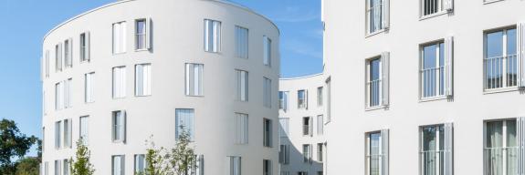 Die Fassade des Wohnensembles erinnert an den typischen Stein der Pariser Bebauung. Die unregelmäßige Anordnung der schmalen Fenster unterstreicht die ungewöhnlichen Wölbungen der plastischen Baukörper zusätzlich.