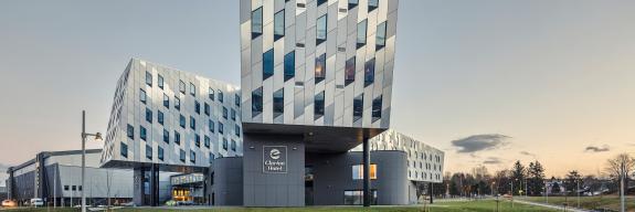 Wie ein Schiff mit aufstrebendem Bug scheint das Hotel Clarion Energy nun über den Ort zu schwimmen. Gehalten wird es von einem Betonsockel, in dem sich die öffentlichen Bereiche des Hotels befinden, wie ein Restaurant und ein Kongresszentrum. Die zwei gekreuzten Riegel darüber fassen 410 Zimmer und wachsen vom Zentrum zum Rand von fünf auf sieben Geschosse. Ihre Fassade besteht in Anlehnung an die alten Konservenfabriken aus ALUCOBOND®-Platten naturAL Reflect, brushed und anodized look. Die asymmetrische Rautenform der Fassadenelemente und ihre unterschiedlichen Reflexionsgrade, matt und spiegelnd, erzeugen eine elegante, bewegte Ansicht, die gleichermaßen im Himmel und im winterlichen Schnee zu versinken scheint. Im Innern setzen die Architekten auf nordische Klarheit, grau-weiß Kontraste, viel Holz und punktuell eingesetzte Signalfarben.