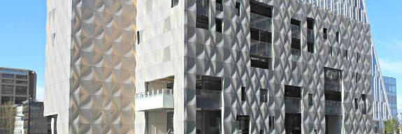 Je nach Lichteinfall und Blickwinkel ändert die Fassade ihre Farbe durch eine spezielle Oberflächenbeschichtung, entwickelt von POHL, die es ermöglicht, dass das Gebäude von golden schimmernd bei Sonnenschein bis zu silbern glänzend bei bedecktem Himmel wechselt.