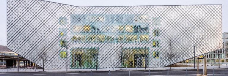 Anerkennung Deutscher Fassadenpreis 2018 für VHF: Futurium, Berlin - Achttausend modular vorgefertigte Bekleidungselemente aus Gussglas erzeugen ein schillerndes, transparentes oder opakes Erscheinungsbild.